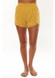 The Hartford Short, made from printed eco-friendly crinkle, and assembled with a front and back elastic waist and flat sides, is charged with a flattering springtime energy. Garment construction includes a ruffle at the top waist and a bow tied in the front.