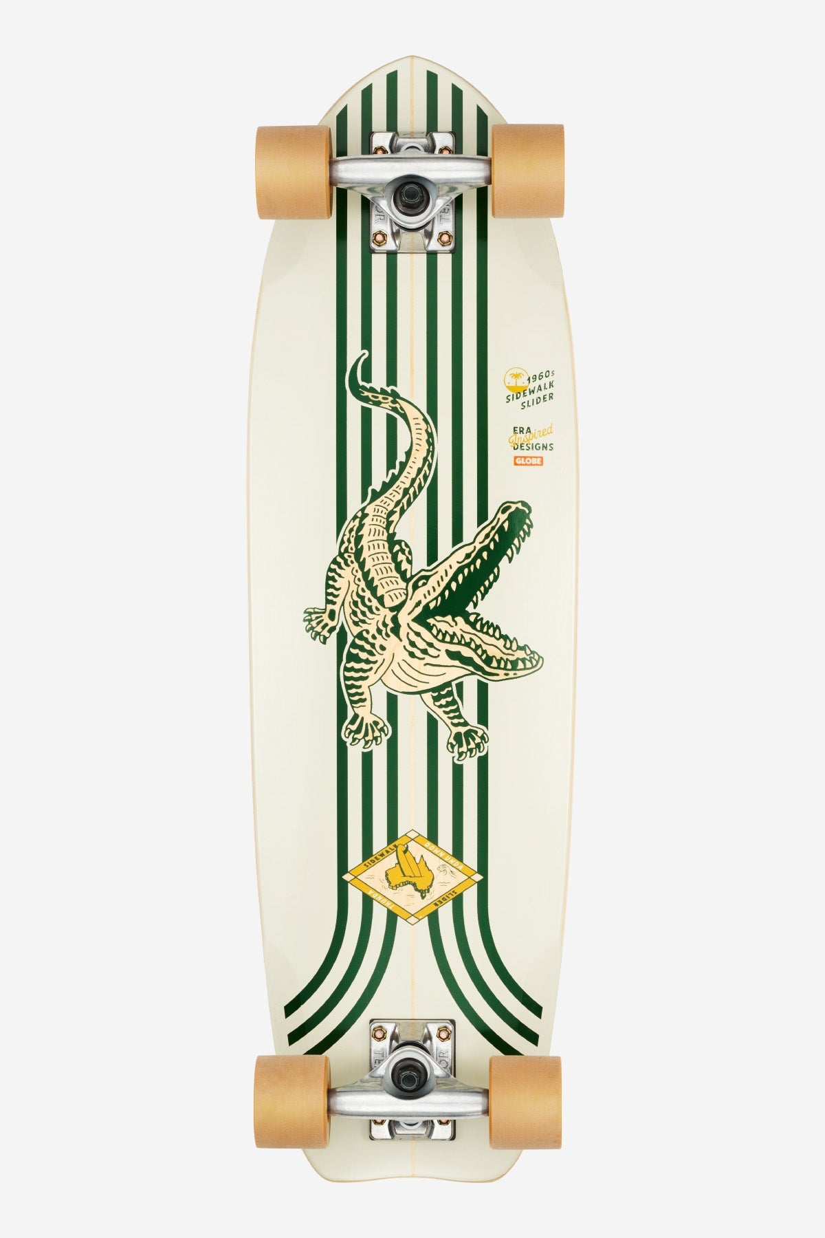 An alternate-future 1960s progression from roller skates on planks to the perfect sidewalk surfer. The Sidewalk Slider in Green/Croc is an era inspired cruiserboard constructed from Resin-7 hard rock maple and featuring a Mellow concave deck, Tensor alloy trucks and 58mm 85a Retro Flex Cruiser wheels. The set up is tuned for maximum good times.